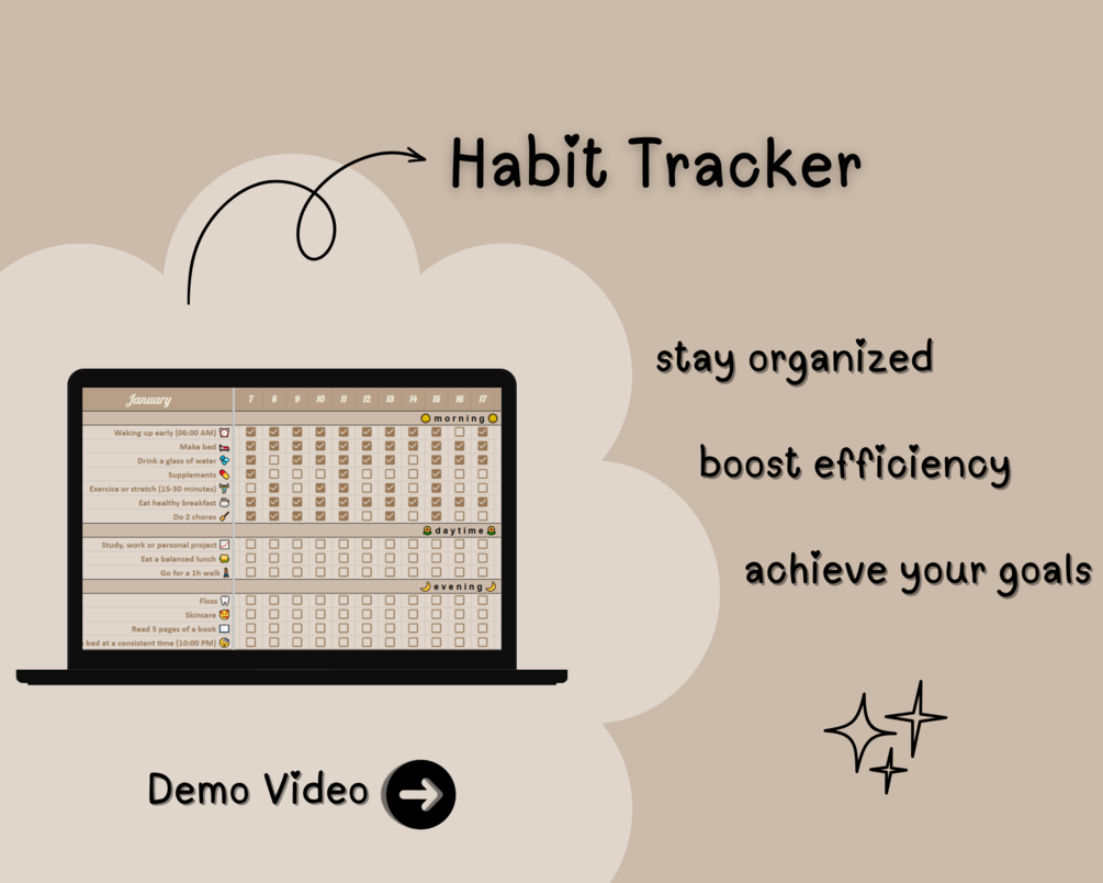 This beautifully designed Habit Tracker is structured to help you build and maintain consistent routines across your mornings, daytime, and evenings. Here's how it works: